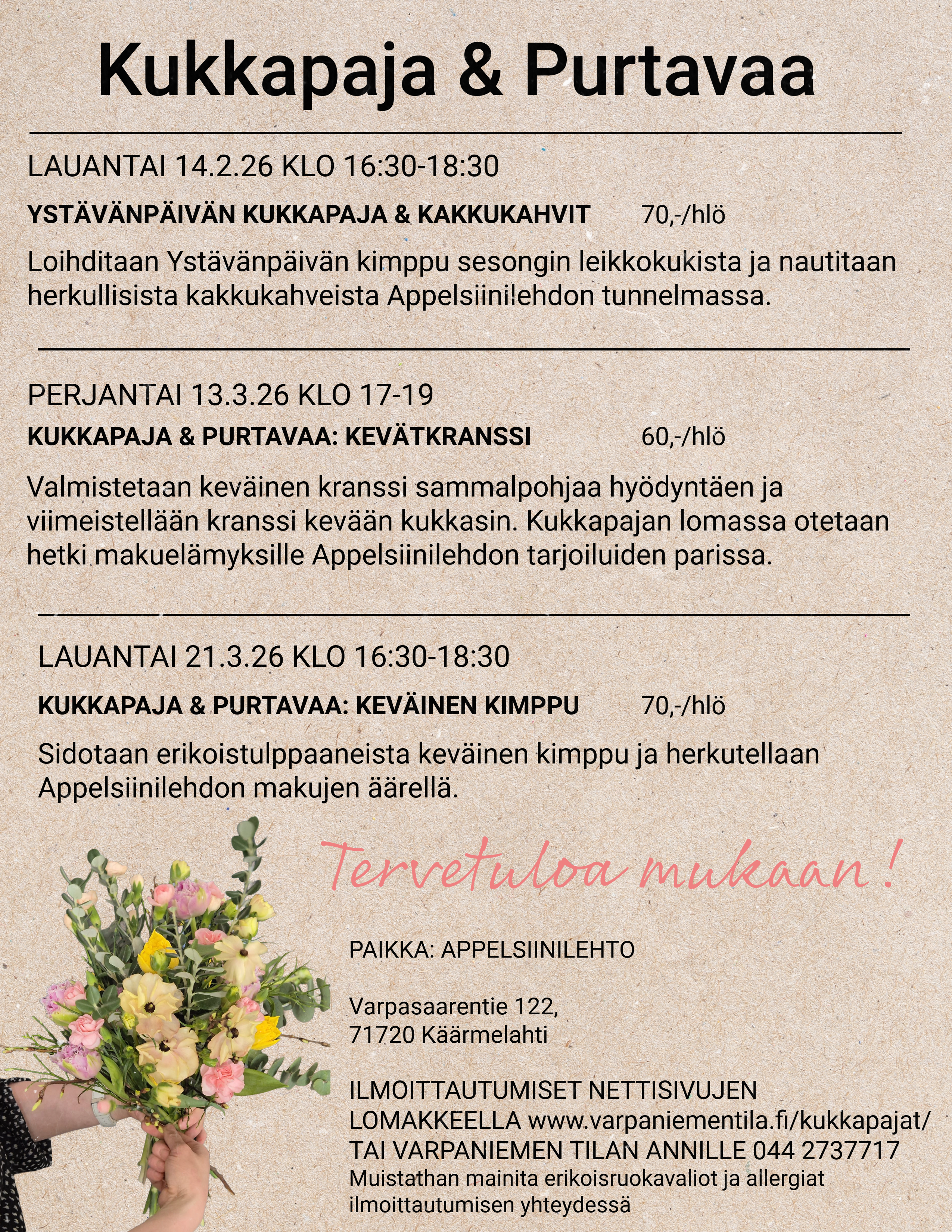 Kirjoita nimesi, puhelinnumerosi, sähköpostiosoitteesi sekä viestiosioon mihin kukkapajaan ilmoittaudut.